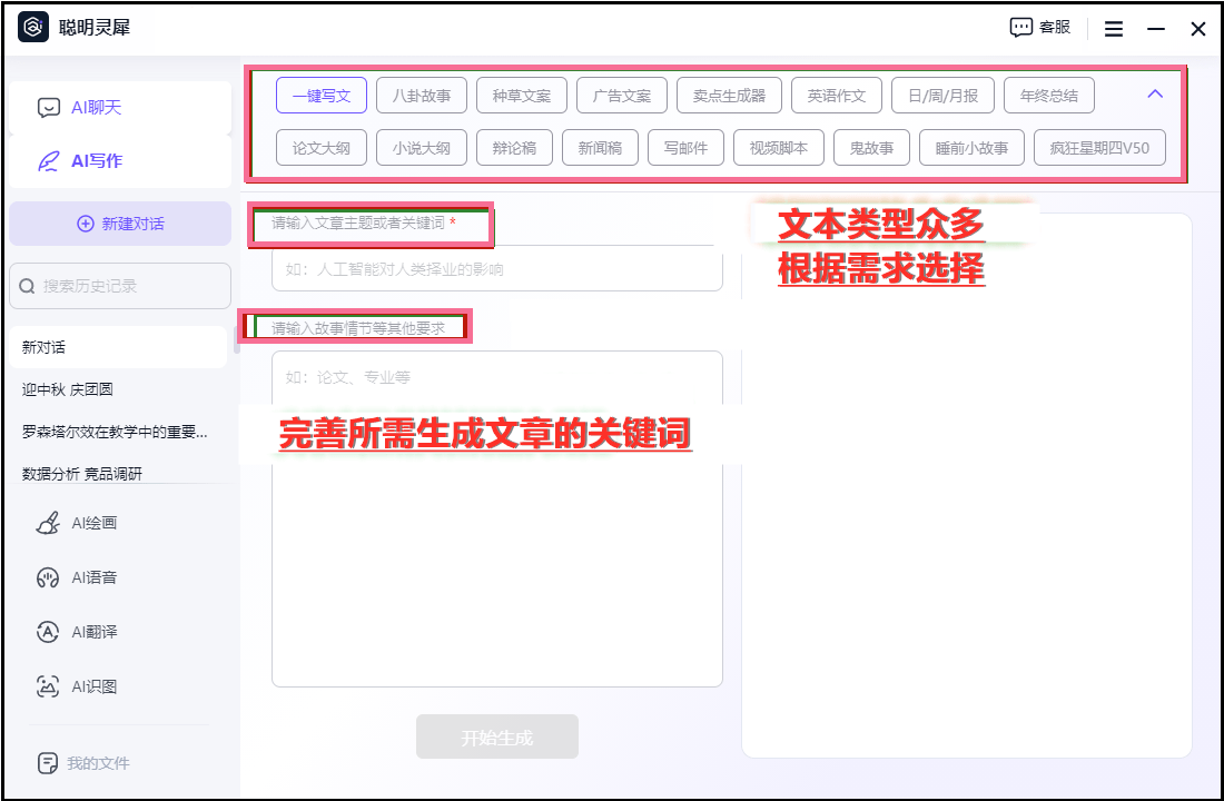 1.按照文章的从题和要求,它们简单易上手,AI Writer都能供给精确、流利的内容。输入相关的环节词或从题词,软件将按照用户的要乞降设定,能够按照你供给的环节词和指令生成高质量的文章。当我们需要完成多种写做使命但时间并不丰裕时就能够借帮一些AI写做软件。